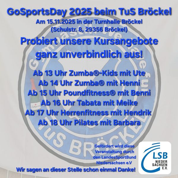 Die Gymnastiksparte des TuS Bröckel lädt alle Interessierten am 15.11.2025 ein, unsere Kursangebote einmal ganz unverbindlich auszuprobieren und zu schauen, ob es ein oder mehrere Angebote gibt, die man neu für sich entdecken kann! Egal ob bereits aktiv in unserer Sparte, Mitglied im TuS Bröckel oder eben noch nicht: alle Kurse können ausprobiert werden und ihr kommt an einem Samstag in den Genuss unserer Angebote.